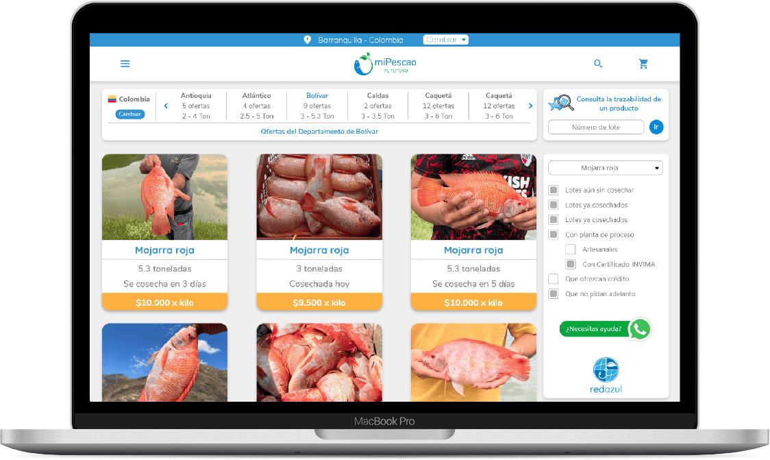 Hoy miPescao SAS se ha convirtido en RedAzul SAS, pasando de ser una plataforma de comercio de la pesca en un modelo B2C a una plataforma tecnológica que ayuda a los pescadores y acuicultores a gestionar, trazar y vender en línea sus producciones en un marketpalce B2B basado en trazabilidad, la confianza, la sostenibilidad y el comercio justo. Para ello integramos varias tecnologías propias, como nuestra app Trazul para acuicultura, Trazul para la pesca, el sistema de bajo costo de traqueo de embarcaciones artesanales y el Marketplace miPescao.com.